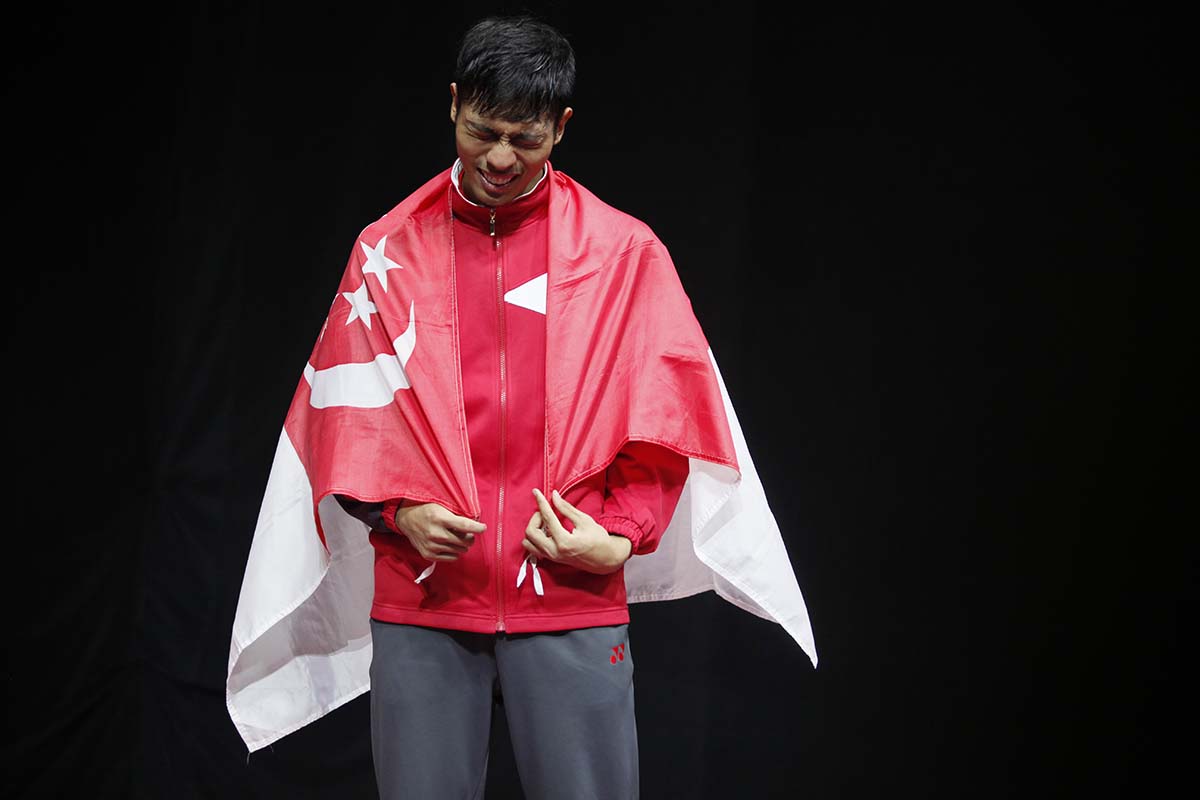 Singapore's Joshua Ian Lim celebrates after winning against Philippines Nathaniel Perez for gold for his team in fencing, men's team foil. Bazuki Muhammad for Action Images via Reuters