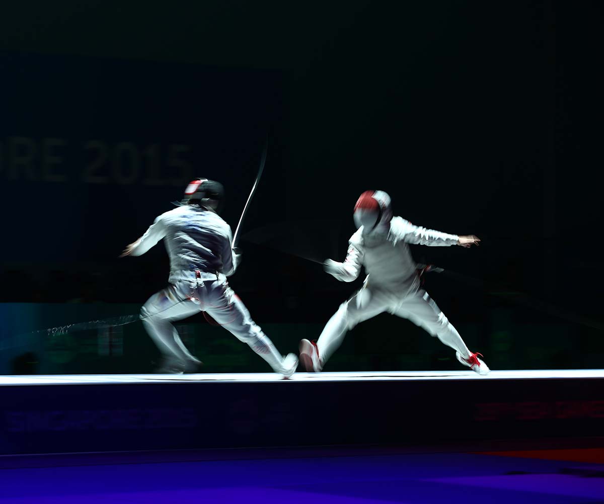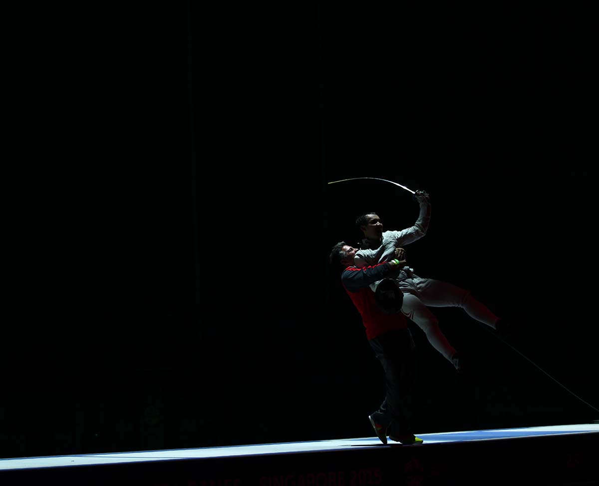 Singapore's Kevin Jerrold Chan (R) and Philippines Louie Brennan Wayne compete for team Singapore against Philippines to win gold in fencing men's team foil. Bazuki Muhammad for Action Images via Reuters