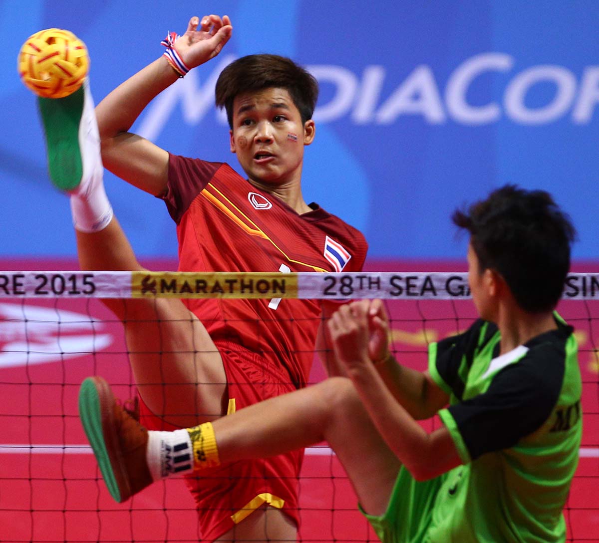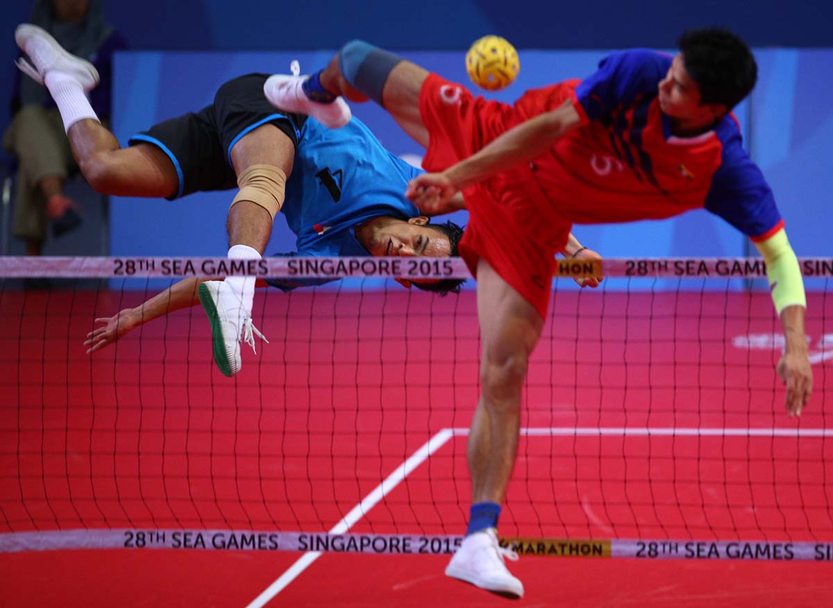 Philippines Rheyjey Ortouste (L) and Myanmar's Zaw Latt compete in sepaktakraw men's doubles. Bazuki Muhammad for Action Images via Reuters