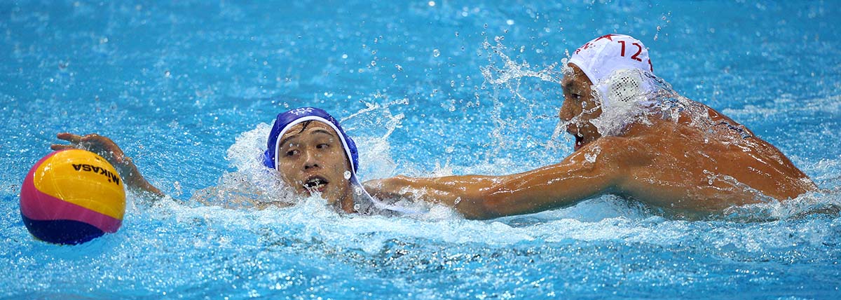 Singapore's Koh Jian Ying (R) and Thailand's Pinit Chaisombat compete in water polo, men's round robin. Bazuki Muhammad for Action Images via Reuters