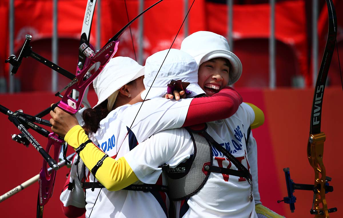 Team Vietnam Le Thi Thu Hien (R) celebrates with Loc Thi Dao and Nguyen Thi Quyen Trang after winning against Indonesia for gold in archery, women's team recurve. Bazuki Muhammad for Action Images via Reuters