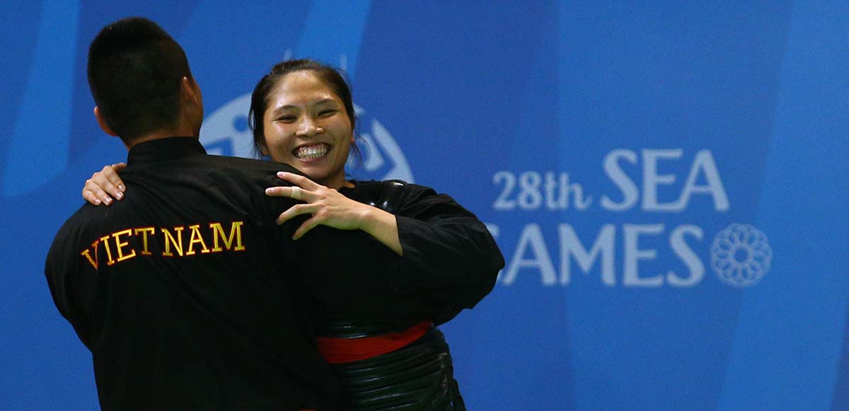 Vietnam's Hoang Thi Loan celebrates with her coach after winning against Indonesia for gold in pencak silat, women's tanding class C (55-60kg). Bazuki Muhammad for Action Images via Reuters