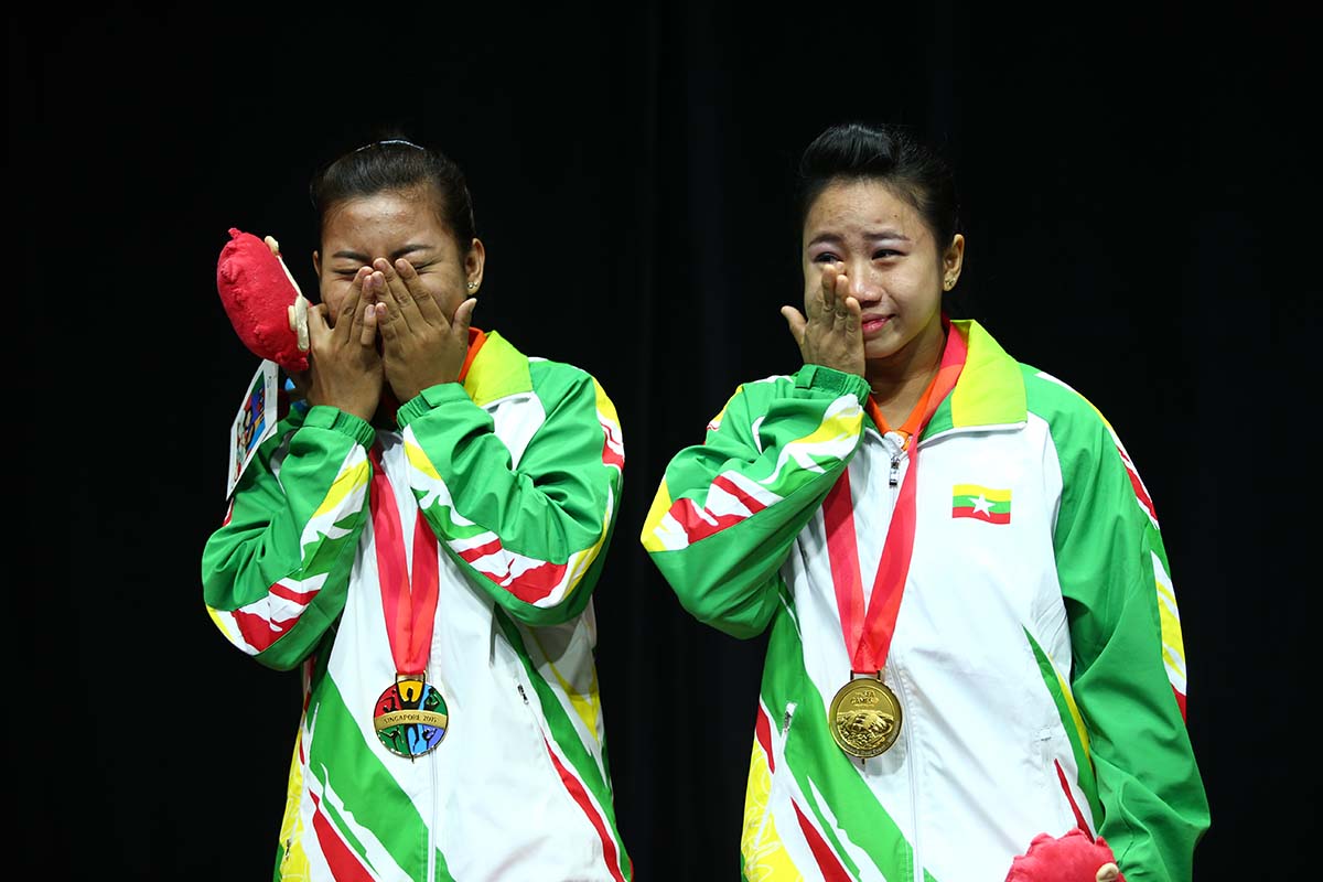 Myanmar's Phyo Myat Thet Su Wai (L) and Myint Aye Thit Sar hold their tears after winning gold in wushu women's duel event. Bazuki Muhammad for Action Images via Reuters