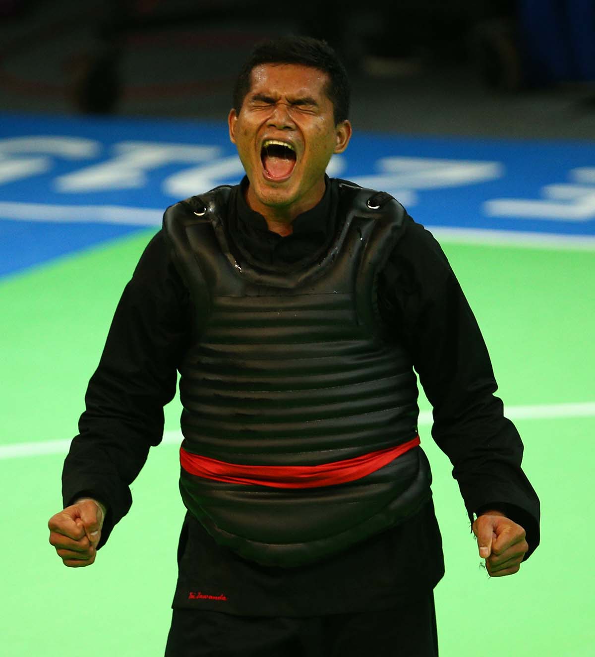 Indonesia's Tri Juanda Samsul Bahar celebrates after winning against Malaysia for gold in pencak silat, men's tanding class H (80-85kg). Bazuki Muhammad for Action Images via Reuters