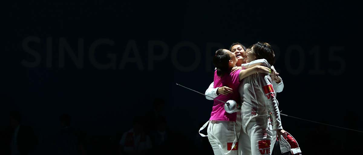 Team Vietnam celebrates after winning against Philippines for gold in fencing women's team epee. Bazuki Muhammad for Action Images via Reuters